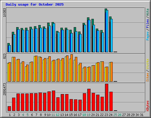 | Day | Hits | Files | Pages | Visits | Sites | KBytes | ||||||